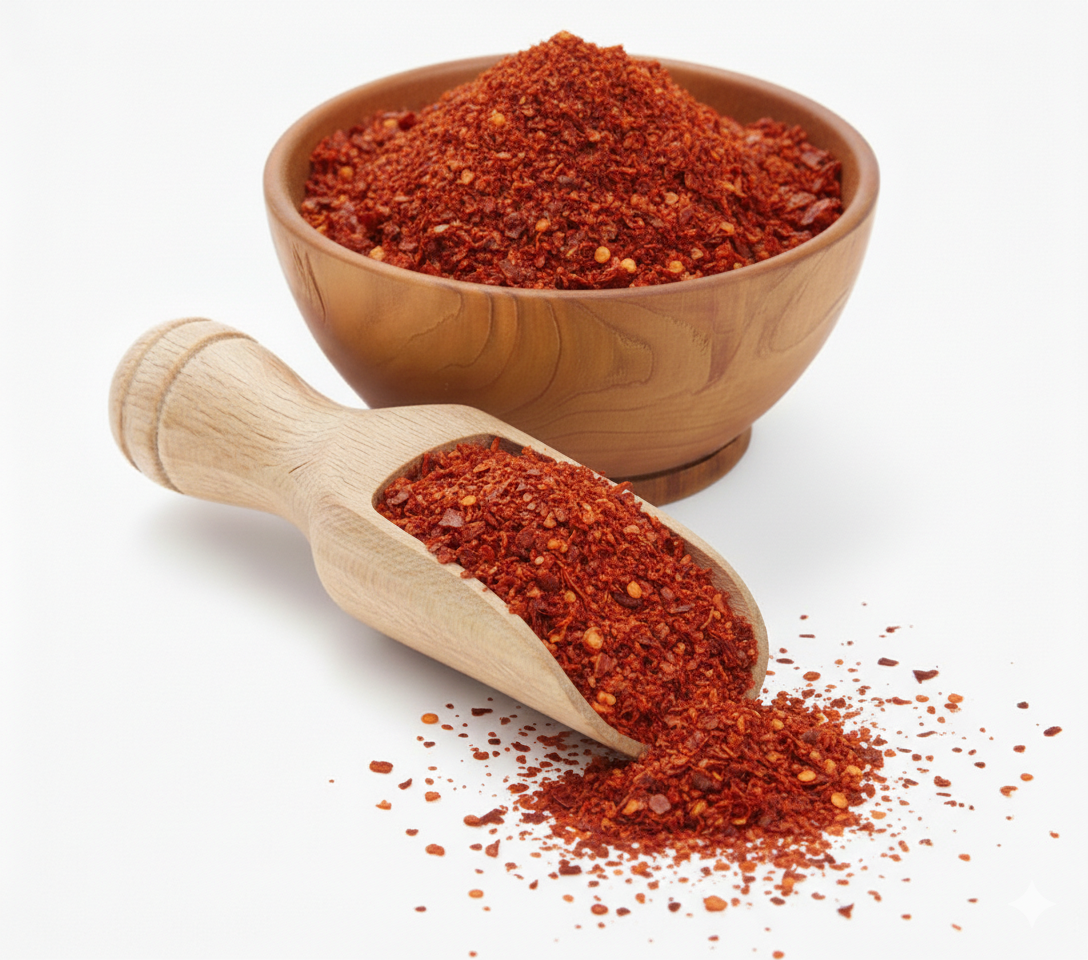 Coarsely crushed dried chillies that add bold heat and rich flavor to a variety of dishes, ideal for seasoning, cooking, and food preparation.